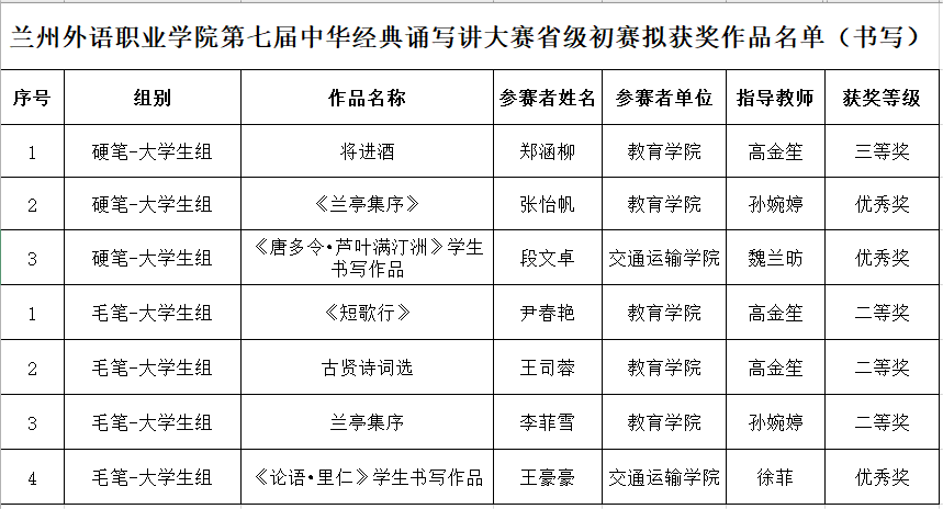 教育學(xué)院鄭涵柳作品《將進(jìn)酒》榮獲“筆墨中國(guó)”漢字書(shū)寫(xiě)大賽大學(xué)生組(硬筆)三等獎(jiǎng);教育學(xué)院張怡帆作品《蘭亭集序》、交通運(yùn)輸學(xué)院段文卓作品《唐多令?蘆葉滿(mǎn)汀洲》榮獲“筆墨中國(guó)”漢字書(shū)寫(xiě)大賽大學(xué)生組(硬筆)優(yōu)秀獎(jiǎng);教育學(xué)院尹春艷作品《短歌行》、王司蓉作品《古賢詩(shī)詞選》、李菲雪作品《蘭亭集序》榮獲“筆墨中國(guó)”漢字書(shū)寫(xiě)大賽大學(xué)生組(毛筆)二等獎(jiǎng);交通運(yùn)輸學(xué)院王豪豪作品《論語(yǔ)?里仁》榮獲“筆墨中國(guó)”漢字書(shū)寫(xiě)大賽大學(xué)生組(毛筆)優(yōu)秀獎(jiǎng)。獲獎(jiǎng)名單如下: